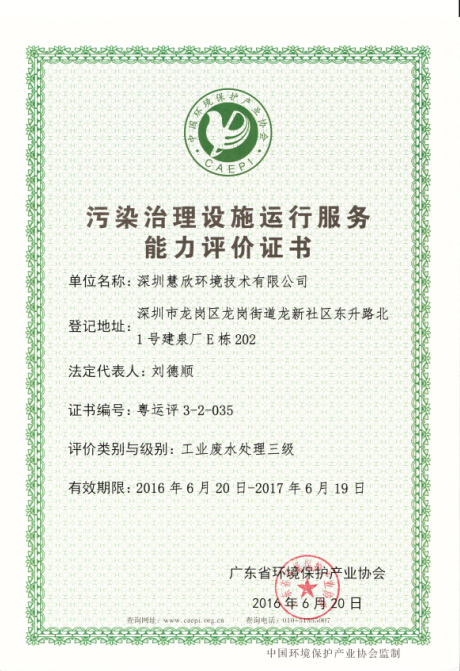 經廣東省污染治理設施運行服務能力評價委員會會議審定及公示無異議后,批準35家單位為2016年第一批廣東省污染治理設施運行服務能力評價證書獲證單位,我公司子公司慧欣環境名列其中,獲得生活污水三級、工業廢水三級證書。